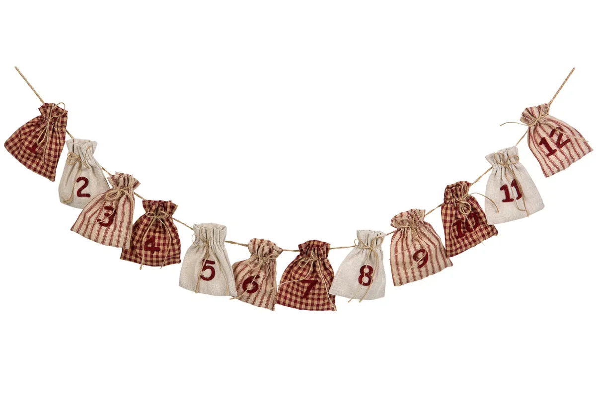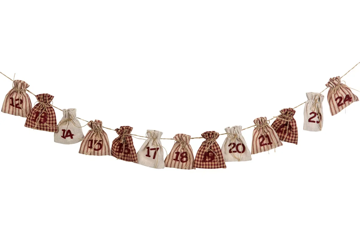 Låt barnen få njuta och känna längtan efter tomten, låt varje dag fram till julafton bli spännande och rolig, med hjälp av vår fina adventskalender i tyg som har 24 små tomtesäckar i gammaldags stil. Fyll säckarna med med egna små presenter och överraskningar. Eller häng presenter med små trä klädnypare i varje säck.. Girlangen har l en ängd på 180 cm. Häng upp på väggen .