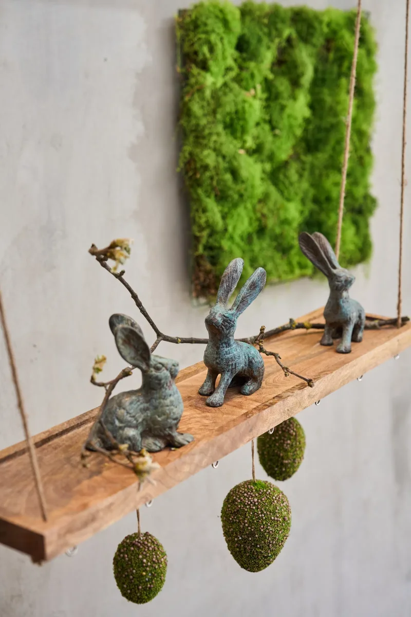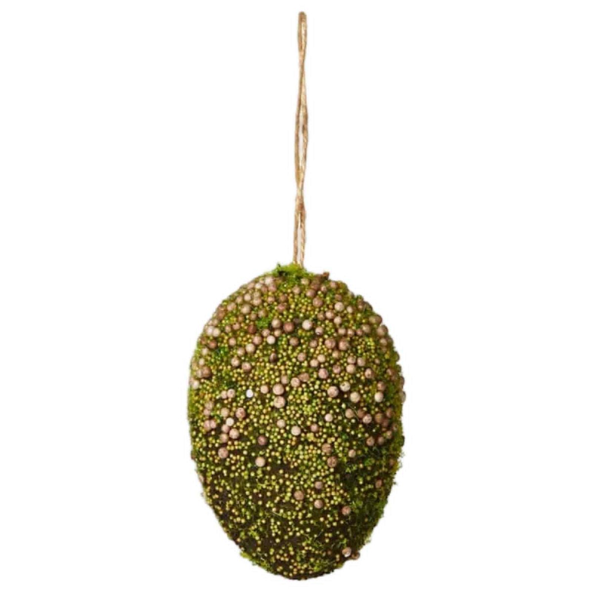 Naturinspirerat hängande påskägg. Det hängande påskägget i imiterad mossa utstrålar en naturinspirerad charm som fångar blicken och för tankarna till skogsgläntors magi. Äggets yta är täckt av en rik, grön mossa som ger en känsla av mjukhet och liv. Denna konstgjorda mossa är konstfullt utformad för att efterlikna naturens egen textur, vilket ger ägget en organisk och autentisk känsla. Över mossans gröna matta strör sig små pärlor i mjuka beige och bruna nyanser, likt skira blommor som just slagit ut i vårsolen. Dessa pärlor tillför en subtil glans och ett lekfullt inslag som fångar ljuset från olika vinklar, vilket ger…