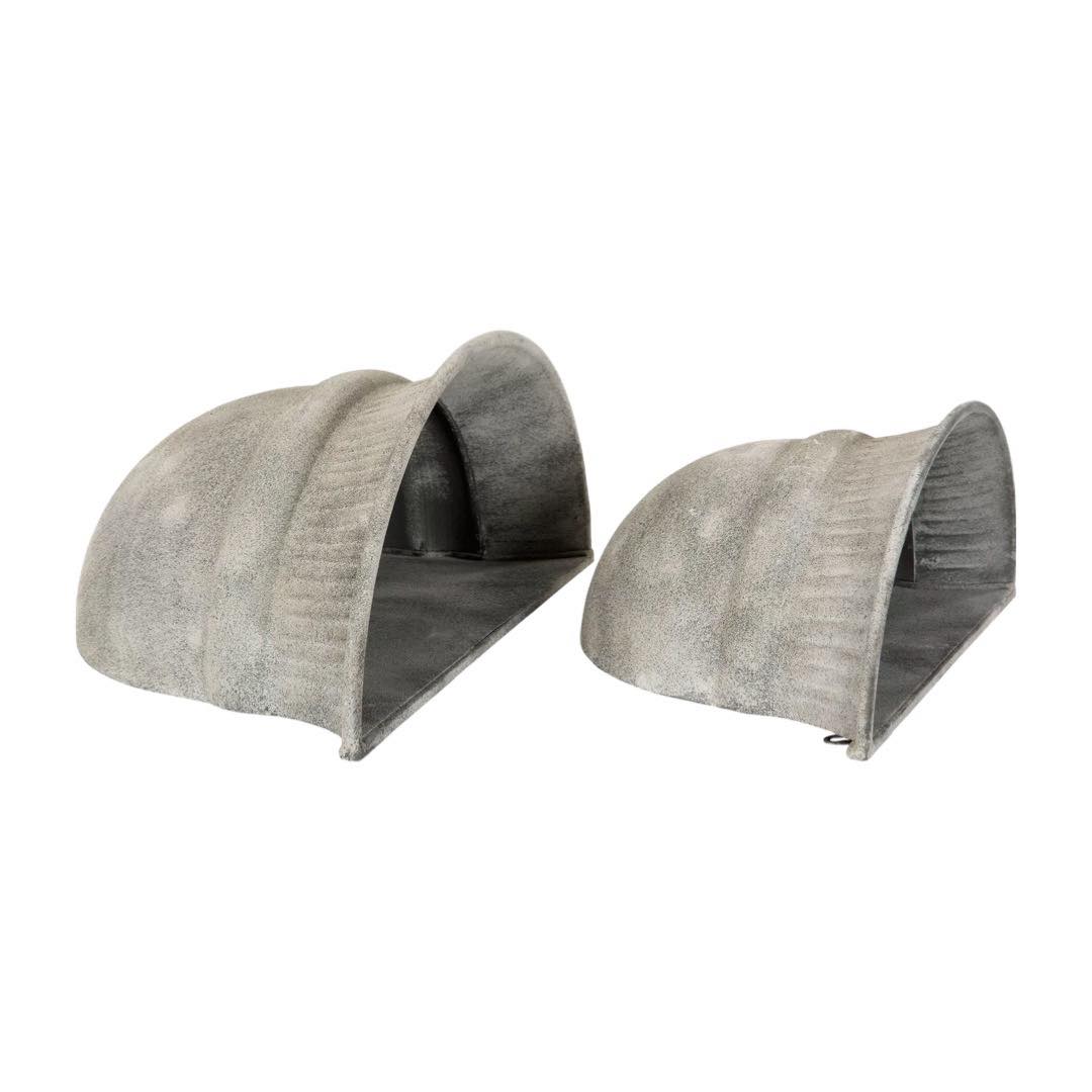 Två grå och mycket dekorativa Väggampelset 2 delar, en stor och en lite mindre i grå metall. Innerkruka i tunn plast finns i båda amplarna. Dessa väggamplar är handgjorda så de kan skilja sig något åt i storlekarna. Mått :Stor 38x25x20,5 cm. Liten:33×22,5×16,5cm Material: metall