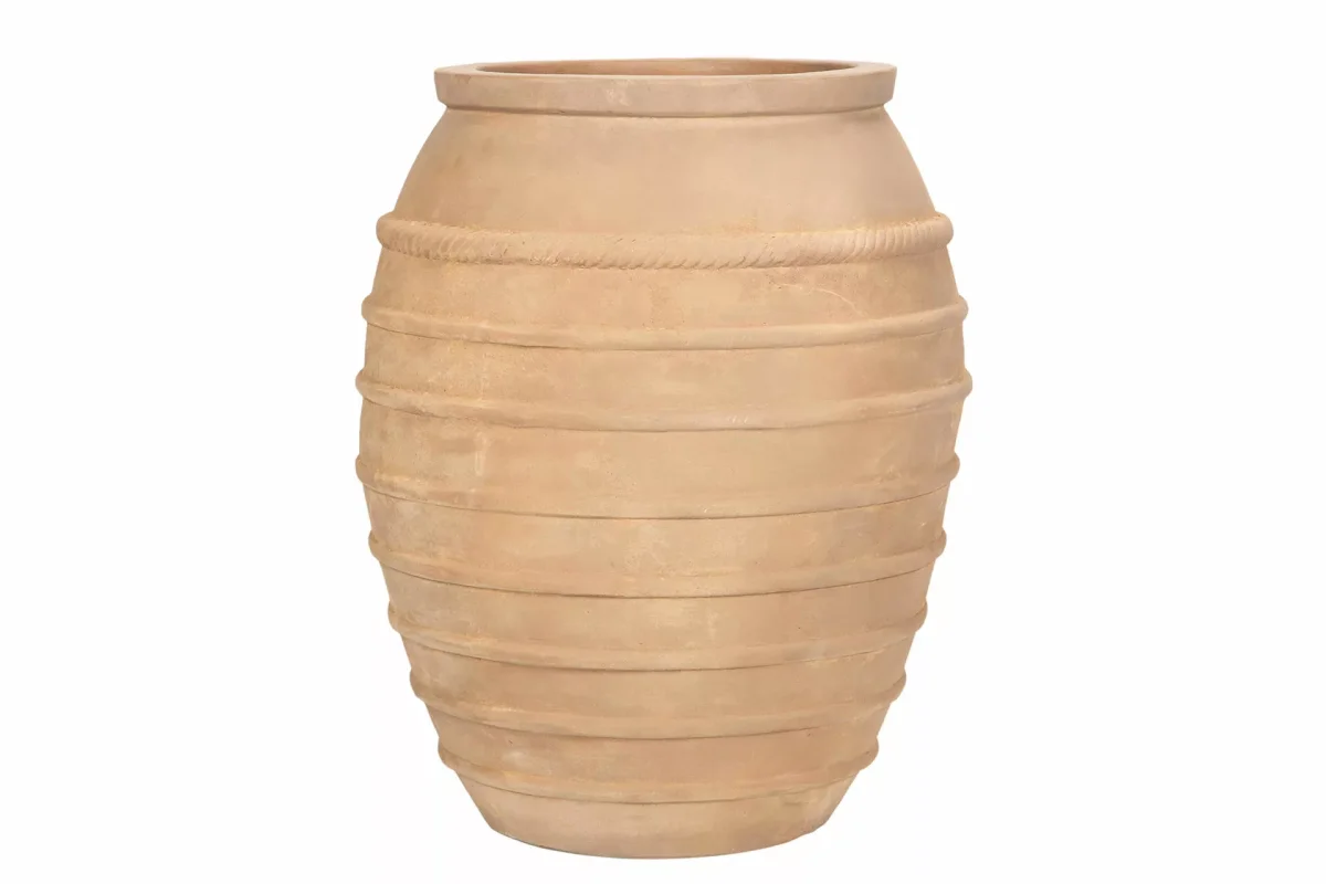 Det här är en terrakotta-kruka med en diameter på 45 cm, en bredd på 27 cm och en höjd på 57 cm. Den är cylindrisk i formen och har en naturlig, jordnära färg som är typisk för terrakotta. På ytan av krukan finns det flera horisontella räfflor som ger den en dekorativ struktur. Krukan har en enkel och rustik design som passar bra i både traditionella och moderna miljöer. Storlek: L: Ø33×27,5×47,5cm. S: Ø23,5x18x33,5cm. Material:Terracotta. Hål i botten
