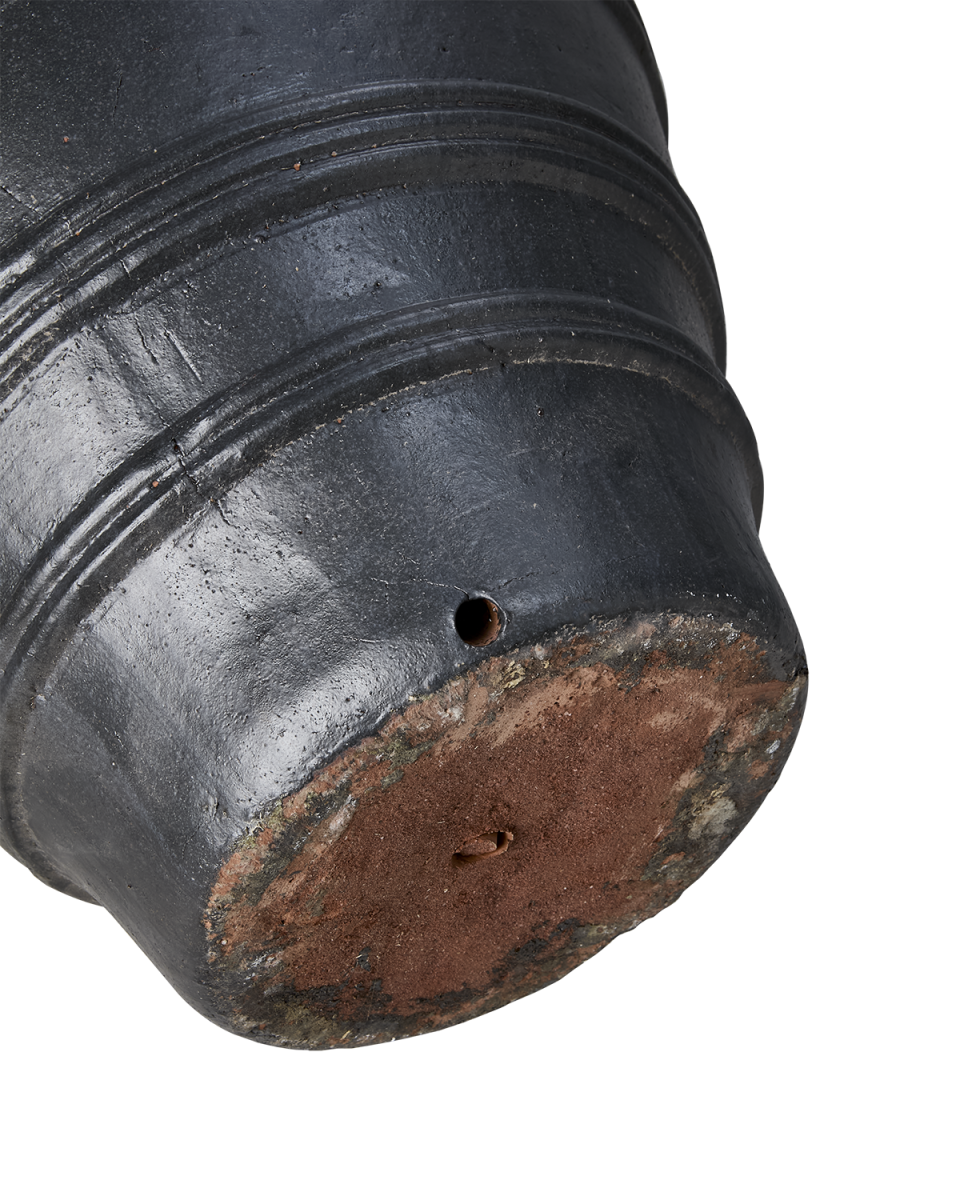 Stor handgjord svart, rund kruka/Urna med en rustik design. Krukan har flera horisontella band och detaljerad dekor nära toppen. Den har två små, ögleformade handtag på sidorna. Krukan är robust och tung. Designen är enkel men elegant, vilket kan göra den lämplig för både dekorativa och funktionella ändamål. Frosttålig. Kommer med dräneringshål, använd vattentäta fat för att undvika fläckar. Glasyren reagerar olika vilket ger varje produkt ett unikt utseende. Då produkten används inomhus, använd filttassar för att undvika att repa underlaget. Storlek: Ø30/54xH71 cm